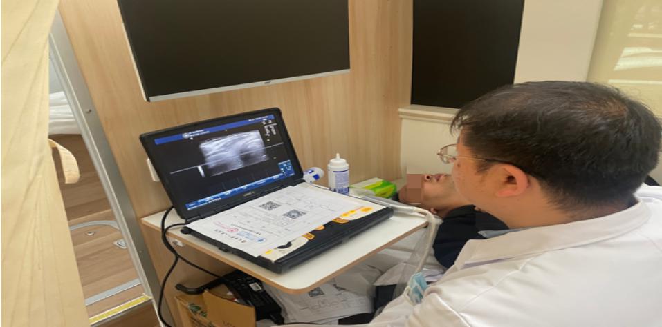 义诊现场的体检车内,乳甲科专家通过便携式超声仪为群众细致检查。咨询台前,专家们耐心询问病史,为群众测量血压、血糖,针对不同人群的健康问题提供个性化诊疗建议和用药指导。
