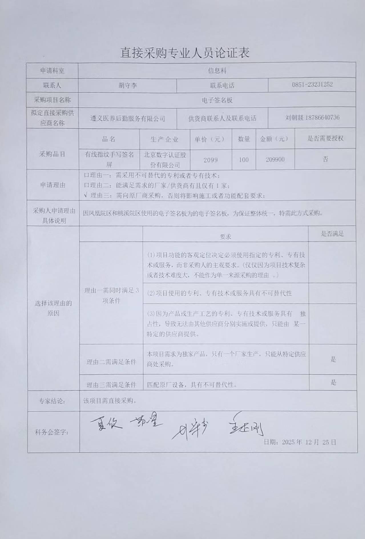 3.采用单一来源采购方式的原因及说明:因凤凰院区和桃溪院区使用的电子签名板为相同此款的电子签名板,为保证整体统一,特需此方式采购。遵义医养后勤服务有限公司作为此项目该品牌的授权供应商,故采用直接采购的采购方式向其进行采购。